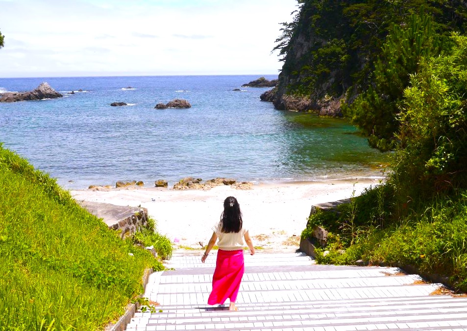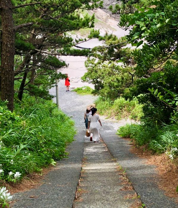 泊海水浴場に続く階段を降りていく。