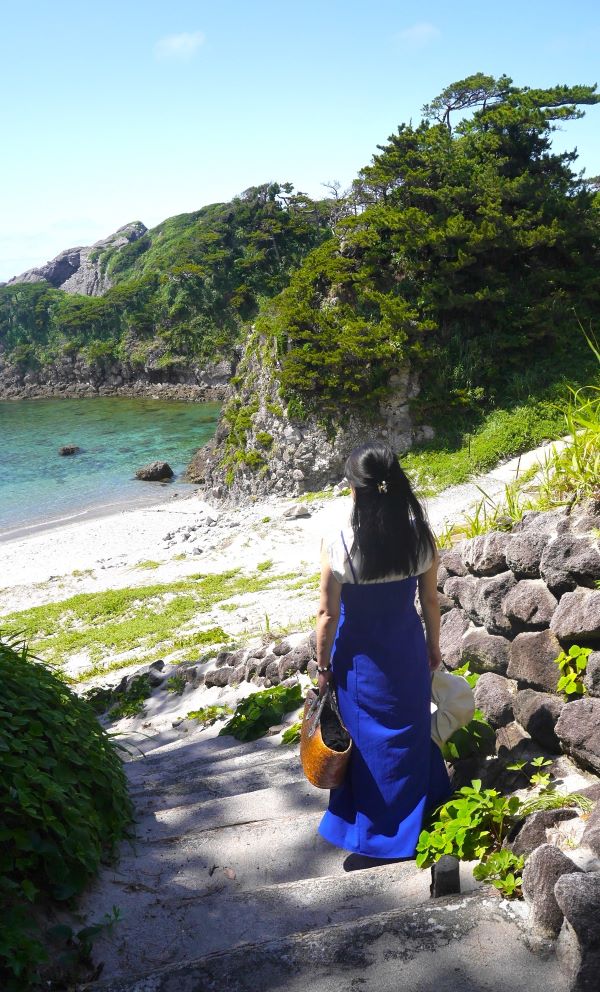 お弁当を食べ終わった容子さん、海へ続く階段を降りていった。
