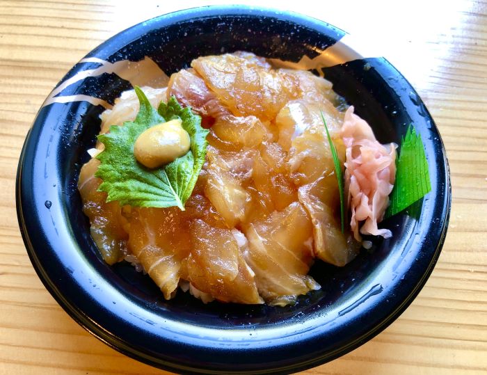 それは、こちら!づけ丼900円です。運が良ければふらりとお店に行っても買えることもあるのですが、とても人気なのと、休日でないとお店に出ていない場合や売り切れていることもあります。もしも、絶対に食べたいのなら、着いた日にお店に行って予約をしたほうがベターです。