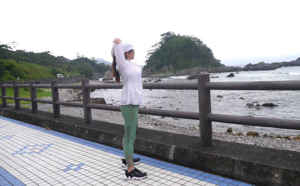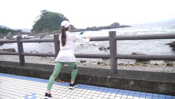 このときは、まだお天気は曇り。晴れていたらここを走るのはかなり気持ちいいはず。朝の少しひんやりした空気の中、海を眺めてストレッチ。日常の仕事疲れも、ストレスも吹っ飛びます。