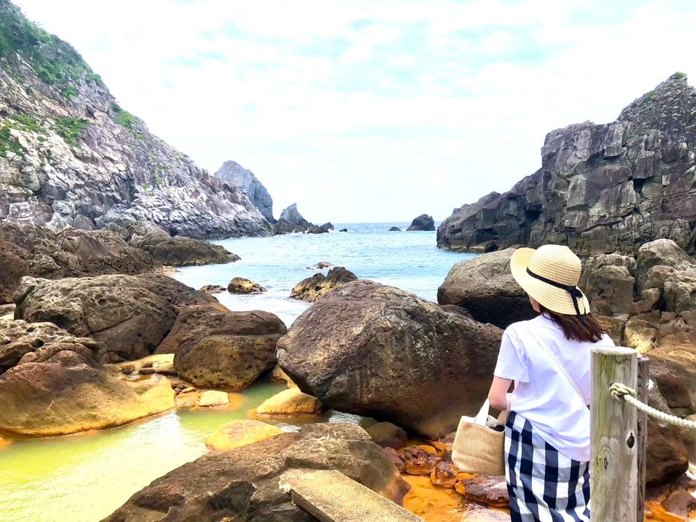 温泉が湧いているところに、海水が混ざって、温度がちょうどいい感じになっている場所を探して入ります。
