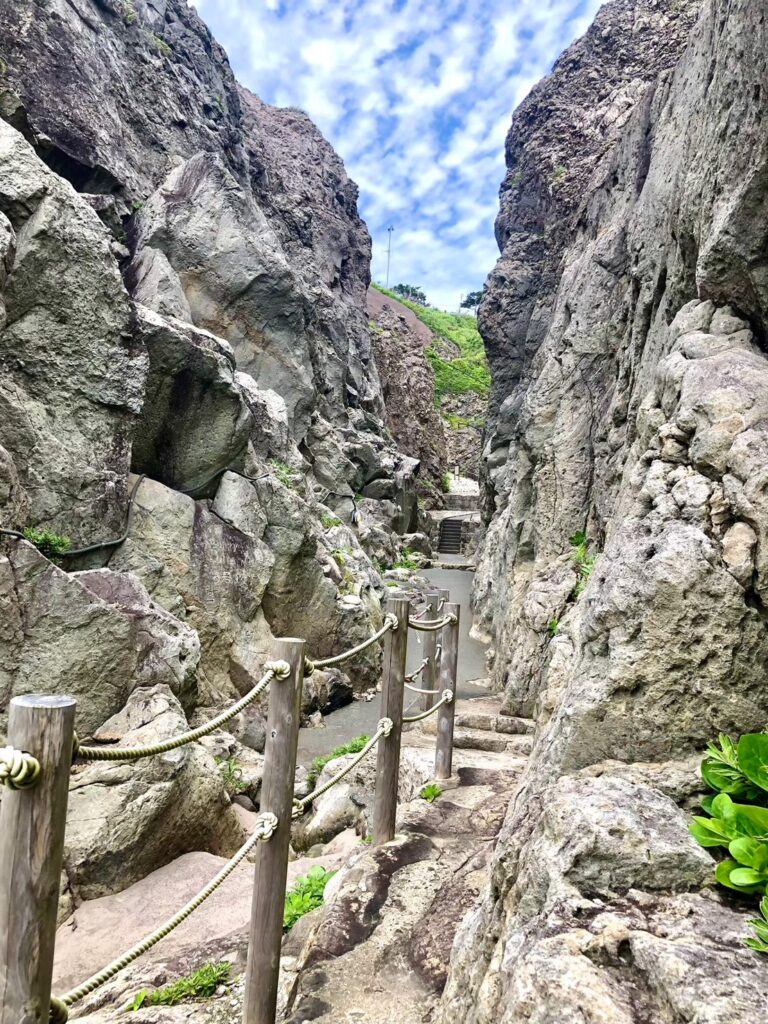 両側の岩肌は、火山噴火でできた岩で、触ってみると軽石のような感じです。