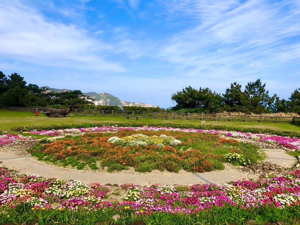 日の出の名所の小の口公園の春の花壇の様子です。遠くに見えるのは新島です。