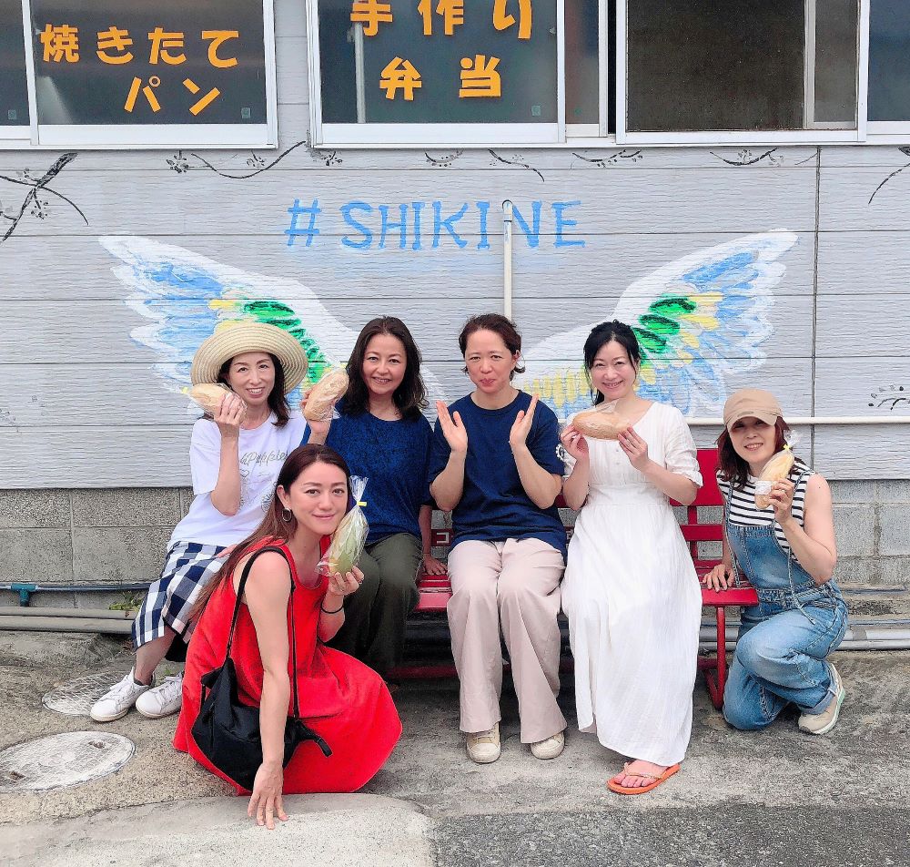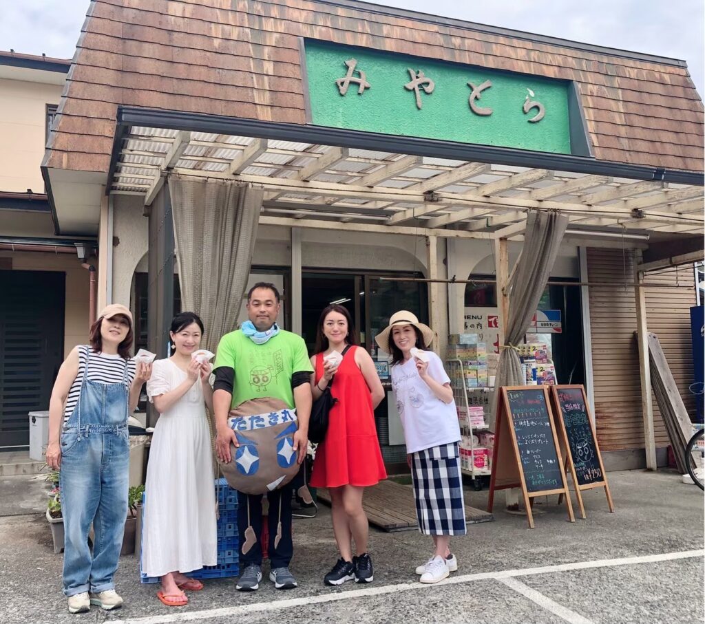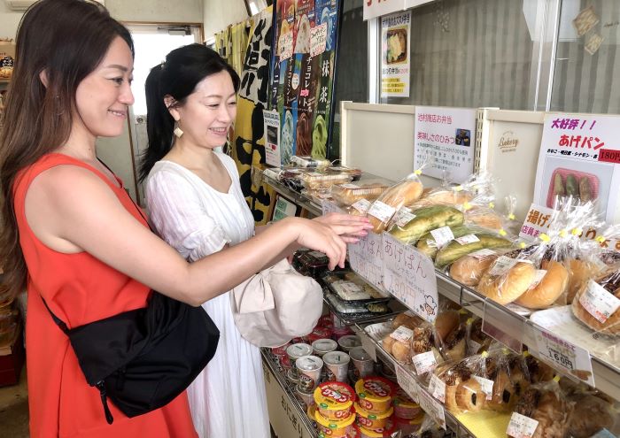 あげパン片手に、池村商店の店主の理恵さんを囲んで集合写真。
