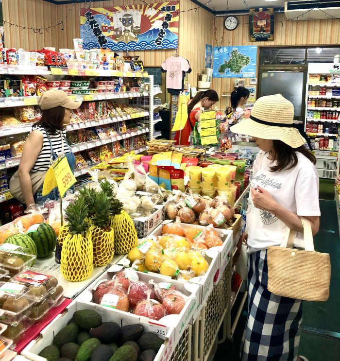みやとらさんの店内です。こじんまりしていますが、食材からお弁当からお酒、飲料、その他、日常に必要なものはたいていそろっています。長期滞在で自炊する人はここに行けば、何でもそろうと思います。