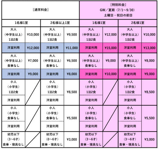 ・食事付きのご予約の方:宿泊料金+¥1,500/1人